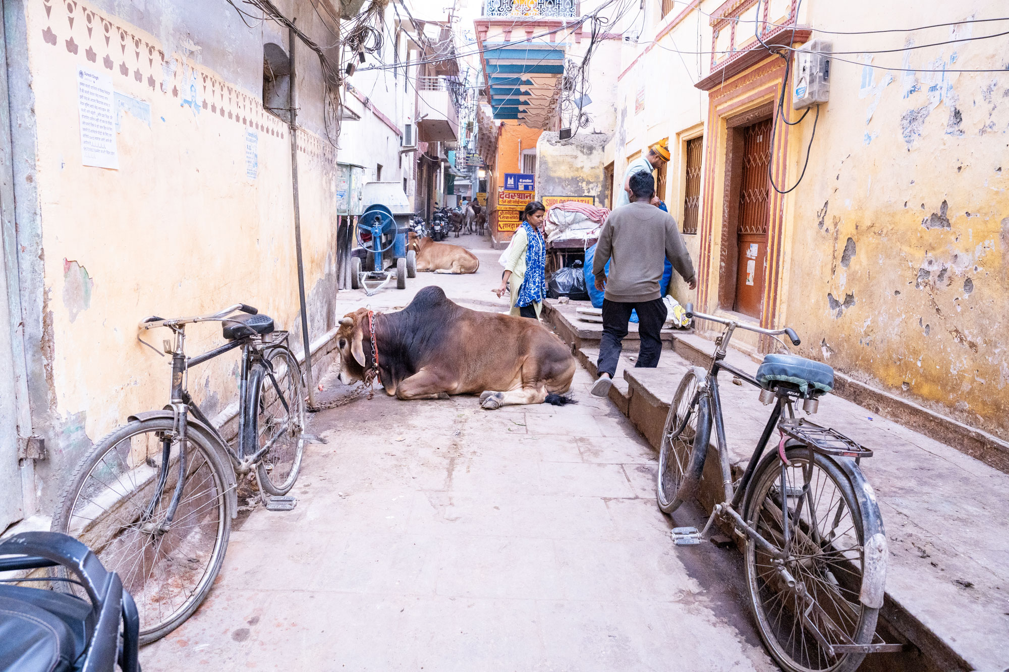 さらに進むと細ーい道に牛さんが鎮座